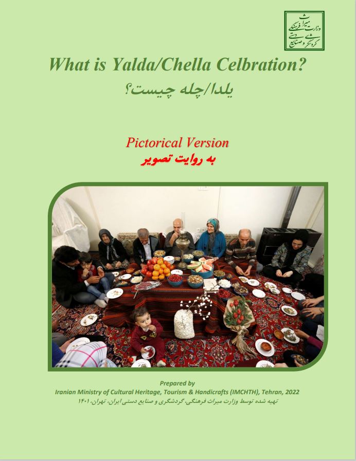 On the occasion of the last night of autumn, families get together. This family reunion often takes place at the houses of elders where people meet around a table called “Yaldā/Chella Night Sofrah”. “Yaldā/Chella Night Sofrah” consists of a lamp that symbolizes light, water that represents cleanliness, red fruits such as pomegranates, watermelons, beetroots, jujube and red and green grapes that demonstrate warmth along with serving broth (Ash), sweets, dried fruits and nuts special to this occasion, all set on “Yaldā/Chella Night Sofrah” and consumed during the nightly gathering. The Sofrah usually comes in red and is traditionally spread on the floor or on Korsi/chairs. The red color used in various components of the Sofrah refer to the reddish sky after the dusk and before the dawn. This feature showcases the relationship between this celebration with the ancient rituals of a Mithraism, i.e. worshiping the goddess of the sun. The type of activities in this celebration ranges from reciting poems, storytelling, reciting Hafiz's poems or referring to them for pleasane omens, reciting verses from the epic poetic masterpiece of Shahnameh, listening to or playing music, singing and giving gifts to new in-laws/brides and children, indoor games and enjoying “Yaldā/Chella Night Sofrah” goodies and items. Women play a key role in this ceremony. Children are also considered as the future bearers/practitioners of the element. The elders are valued as its bearers. While observing “Yaldā/Chella” items such as cultural identity, attention to nature, and respect for women, friendship, hospitality, cultural diversity and peaceful coexistence are manifested and respected.