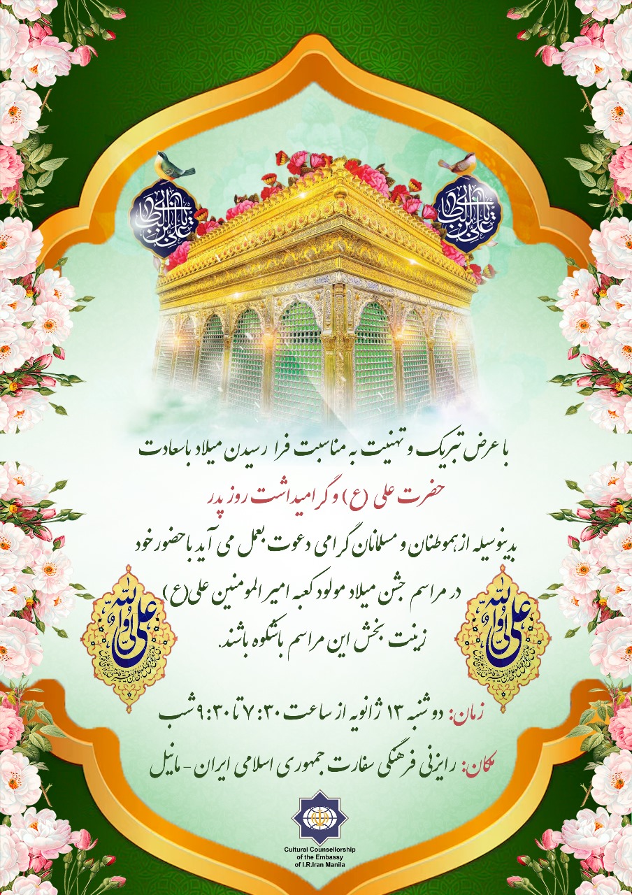سفارت جمهوری اسلامی ایران- مانیل، فرارسیدن میلاد فرخنده و باسعادت مولی الموحدین حضرت امام علی بن ابیطالب (علیه السلام) و گرامیداشت مقام پدر را به تمامی هموطنان محترم، مسلمانان، شیعیان و محبین خاندان عصمت و طهارت بویژه ایرانیان محترم مقیم فیلیپین تبریک و تهنیت عرض می نماید.