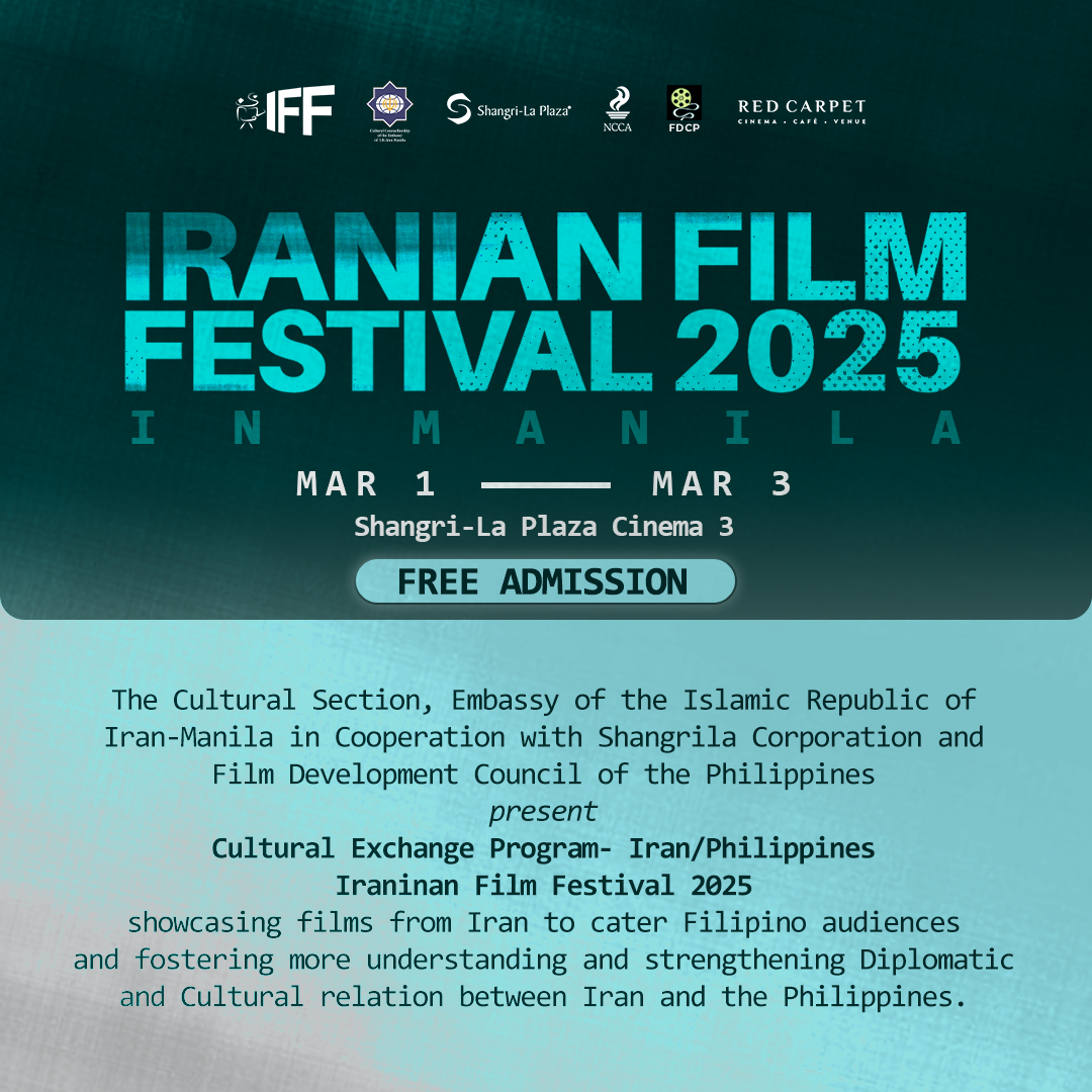 رایزنی فرهنگی سفارت جمهوری اسلامی ایران- مانیل، هفته فیلم ایران را از تاریخ 11 لغایت 13 اسفند 1403 (1 الی 3 مارس 2025) در Shangrila Plaza Cinema3 برگزار می نماید.